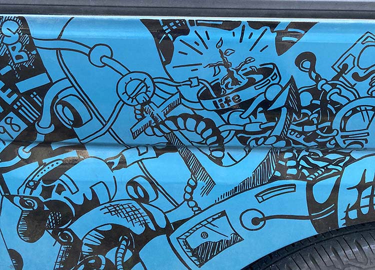 日本では多くのゴミが出ている。この現実をアートを通して伝えることによって、多くの人が考える機会とすることを目指して作品制作を行った。実際に廃車が決まっていた車に直接メッセージ性のある絵を描き、それを動画と写真とで一つの壁に表現した。実際に、この車を修理して私が乗っていく。