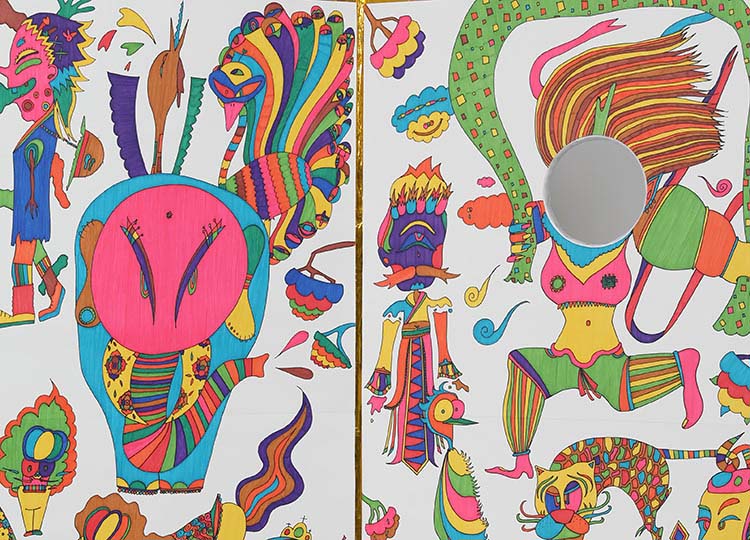 「おかゆちゃん」というPOPで奇妙なイラストを、日本美術とフュージョンさせ、屏風という大きなキャンバスに描いた。さらにこの屏風は顔はめパネルにもなっており、観客を「おかゆアート」の一部とすることができる。材料は誰もが手にすることのできる物を使用し、アートの幅を広げる作品を目指した。